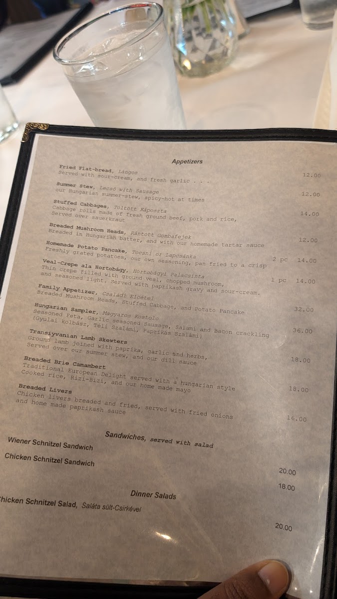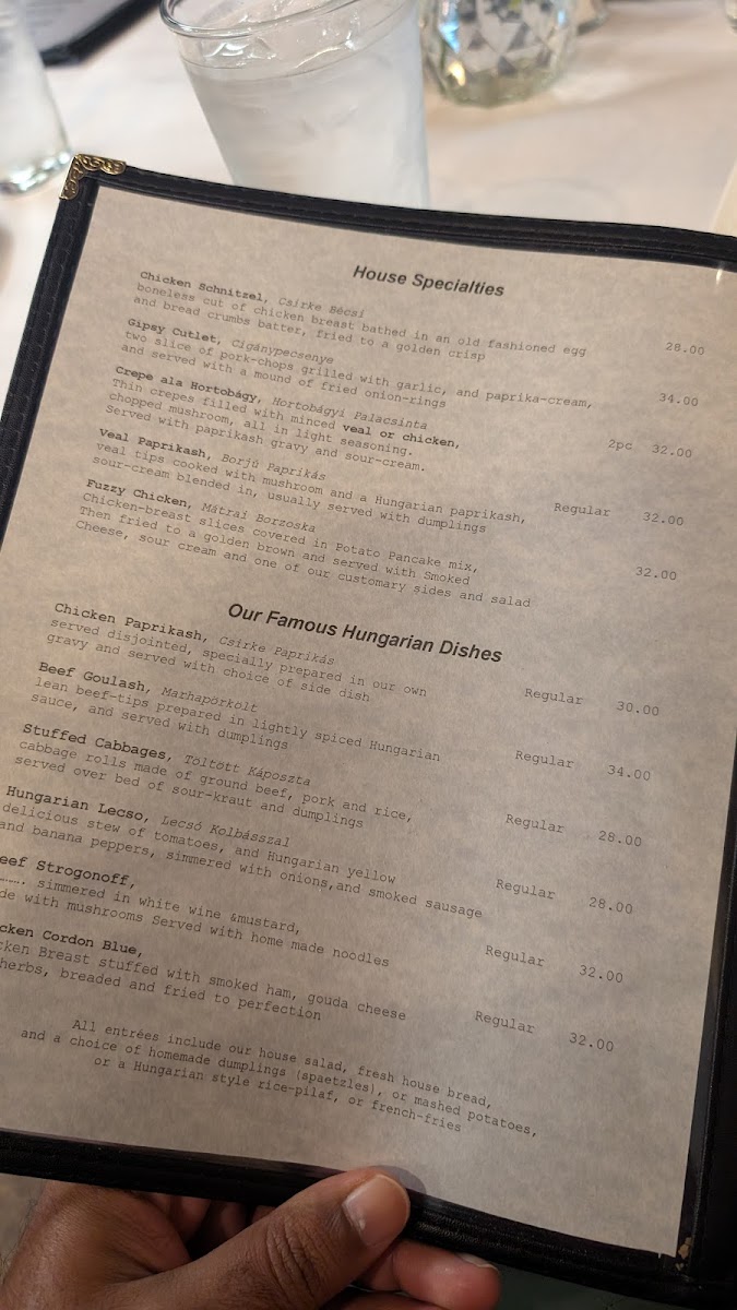 old recipe for veal-lovers. thin crepe filled withground veal, chopped mushroom, and seasoned light, served with paprikash gravy and sour-cream