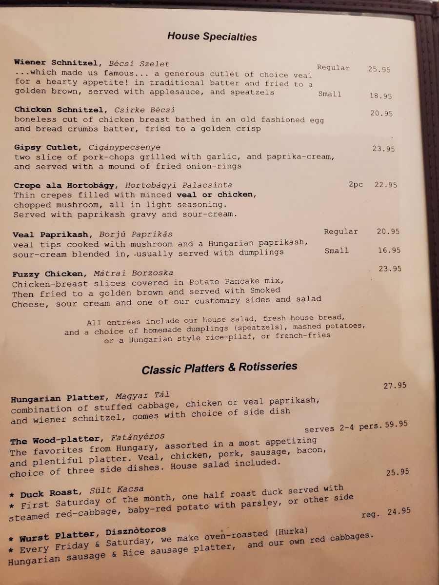 the favourites from hungary, assorted in a most appetizing two person platter. veal, chicken, pork, sausage, bacon, with three side dishes. 2 pers